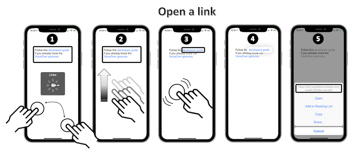 Then, double-tap and hold with one finger once the link is selected until a popup shows up and an action sheet appears to suggest the appropriate option.