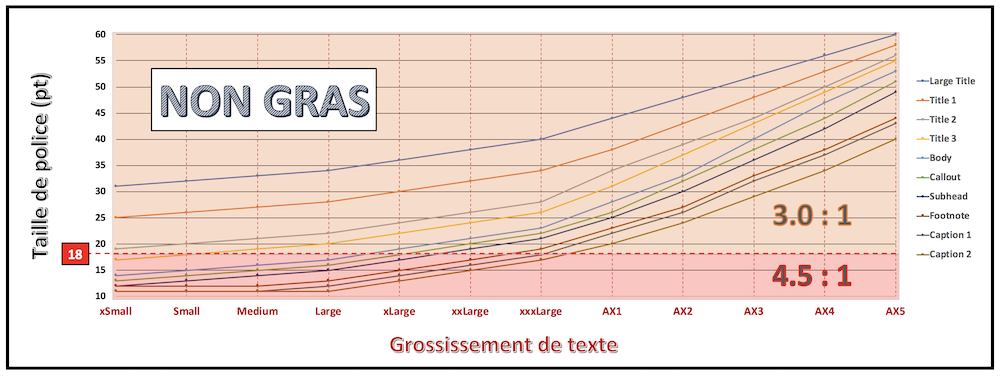 Avec l’apparition du Dynamic Type permettant de modifier de façon conséquente la taille de police, le contraste des couleurs n’est pas nécessairement figé et doit s’adapter au grossissement souhaité.